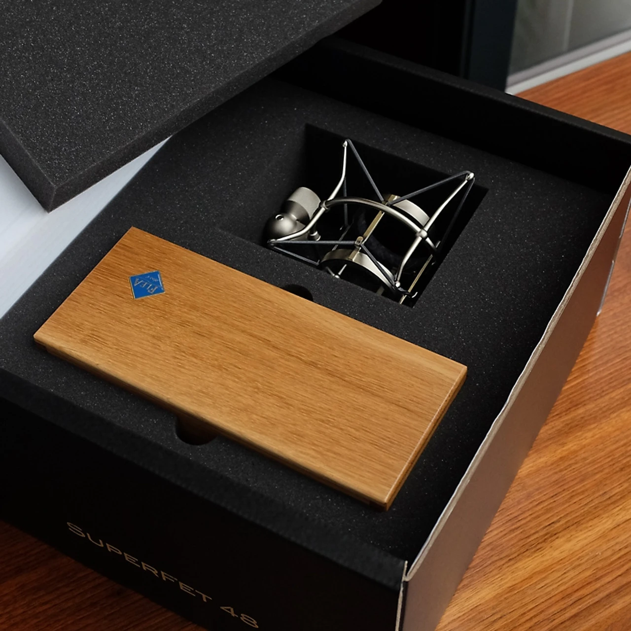 To keep your microphones safe, in standard packaging is our handmade oak wooden box for the microphone. The part of the standard package is also our heavy duty shockmount.