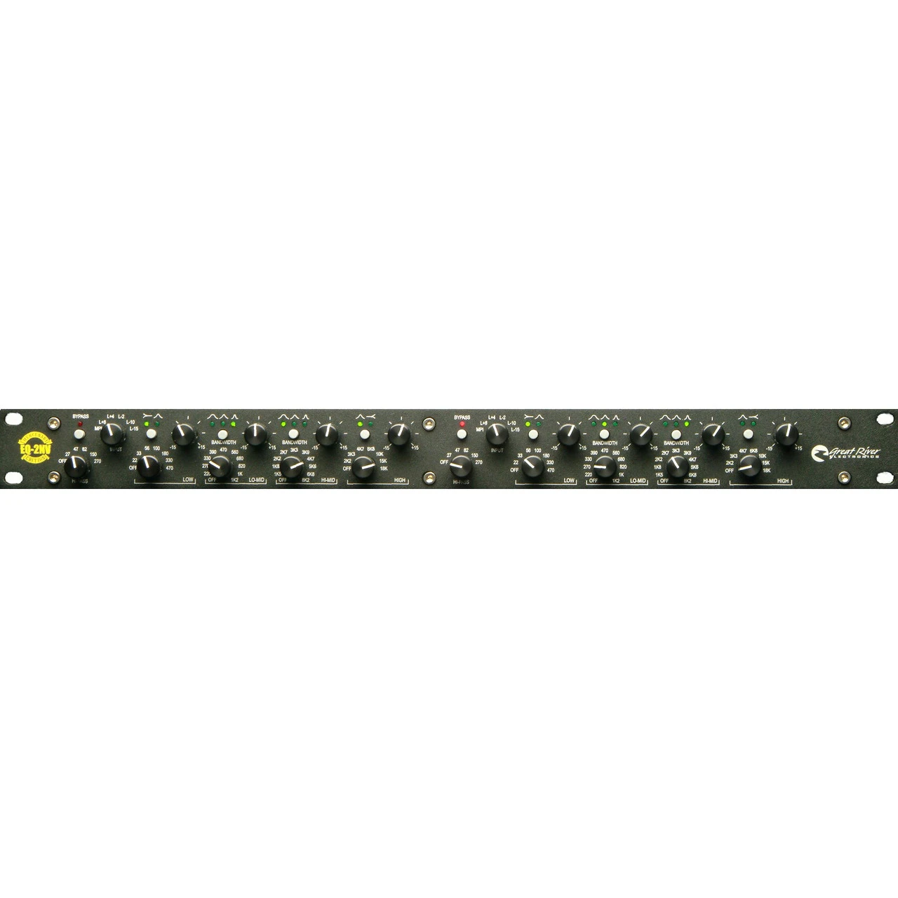 To make life in the studio (and on the road) easier, the EQ-2NV has been specifically designed to integrate with the patch loop in Great River NV Series microphone preamplifiers (with a single TRS ¼” cable), for complete flexibility in tracking and mixing. The front panel input selector / sensitivity switch offers the option of using the signal from the EQ-2NV’s transformer-coupled line input (ranging from +8dbm to -20dbm), or the patched signal from the NV preamp. When connected via the patch loop, the four EQ sections are inserted between the microphone (or DI) input’s first gain stage (with level control and metering) and the preamplifier’s output gain stage and “big iron” transformer (also with level control and metering). This routing flexibility provides a broad range of sonic/harmonic possibilities and maintains a full Class-A signal path.